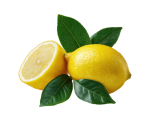 Close-up of two lemons, one whole and one sliced, with vibrant green leaves