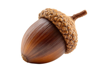 Close-up of a ripe acorn still wearing its textured cap, isolated on a transparent background, ready for compositing