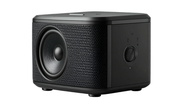 Modern, angular, black audio speaker with fabric grill and controls