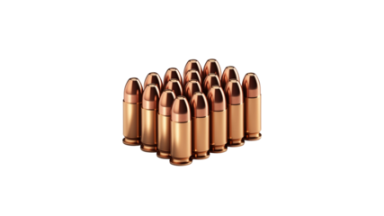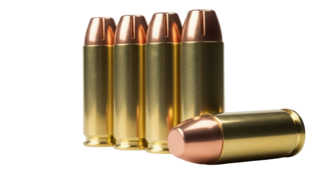 Four 45 ACP bullets standing isolated PNG, ammunition for firearms and self-defense on transparent background