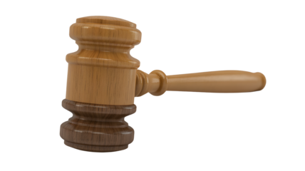 Wooden judge's gavel and sounding block symbolizing justice and law in courtroom decisions isolated on transparent background