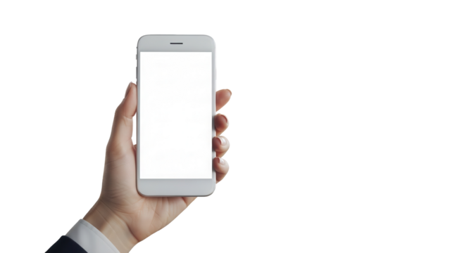 Professional hand holding smartphone with white display in modern real estate office Isolated on Transparent Background