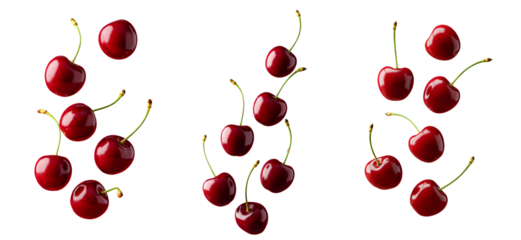 cherry png. cherries isolated. Fresh cherries falling down isolated. Juicy red cherries tumbling in mid-air png. Cherries dropping from above in motion isolated. Ripe cherries scattered while falling