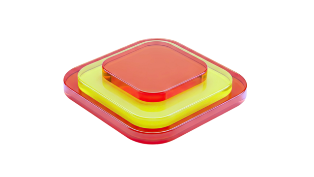 A cohesive modern art sculpture with blue glass, red ceramic, green felt, and yellow acrylic cubes, isolated on a transparent studio background with copy space. Concept of material contrast and