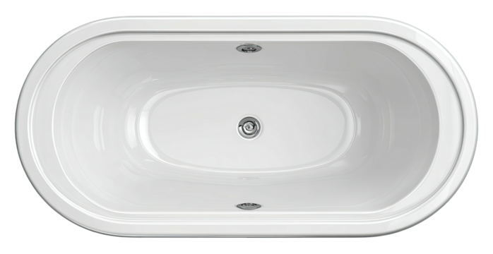 Overhead view of a clean, oval-shaped bathtub with drain and fittings. Pure white finish