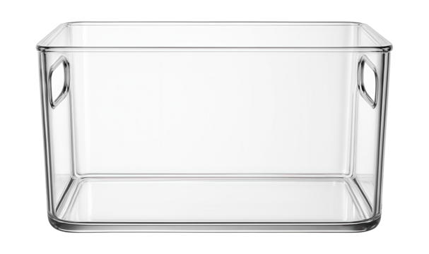 Clear acrylic refrigerator bin with handles, perfect for organizing fruits and vegetables in a home kitchen.