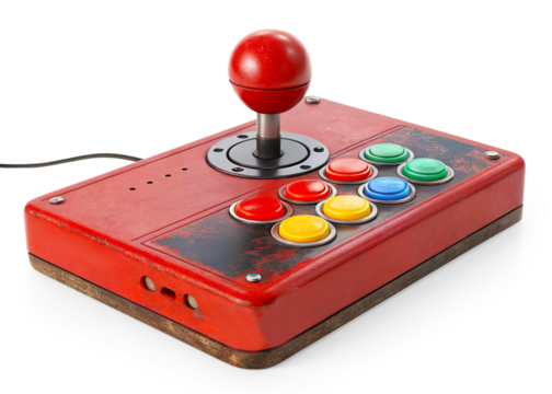 Vintage arcade game controller featuring colorful buttons, multilayer design, unique button layout, essential gaming hardware for nostalgic gaming experiences On Transparent Background.