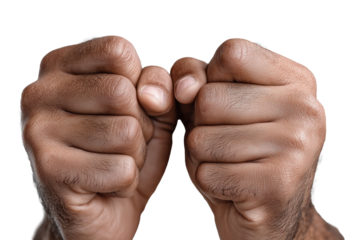 Raised black hands Fist: A Close-Up of an Arm Extending Upward with a Clenched Fist, Isolated on a White Background, Symbolizing Strength