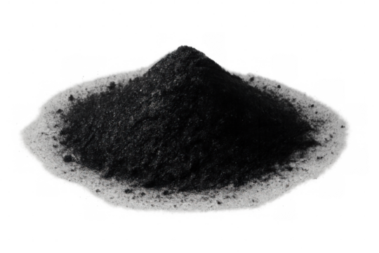 Black carbon powder heap isolated on transparent background, activated charcoal ingredient for cosmetic and industrial use
