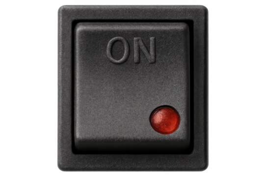 Rocker switch in the on position illuminating a red light indicator, representing power, control, and activation with a transparent background