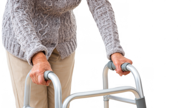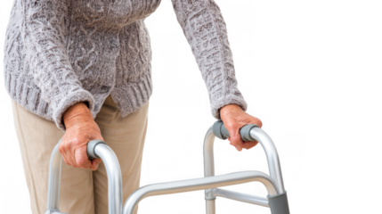 Senior man using a walker for support and mobility, promoting independent living and overcoming physical challenges in old age, with transparent background