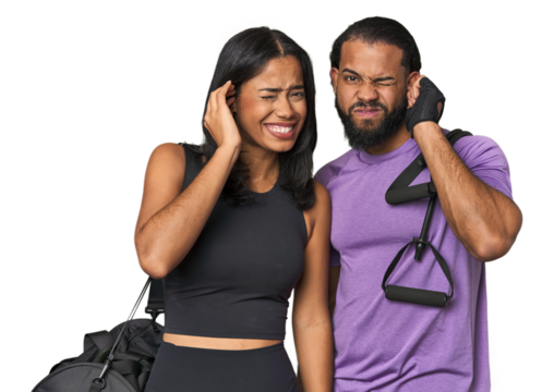 Young Latino couple ready for gym training covering ears with hands.
