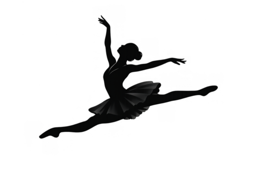 Ballerina silhouette performing elegant mid-air dance leap in classic tutu with graceful pose, transparent background