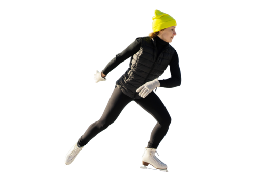 A determined woman sprints, hydrating mid-run. She holds a water bottle, eyes focused, clad in athletic gear, against transparent background.
