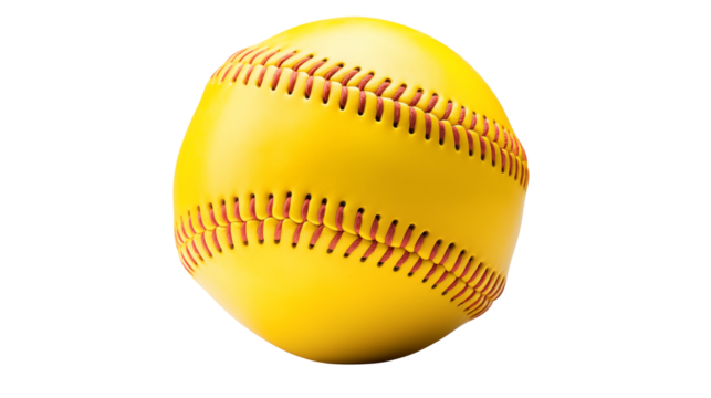 Vibrant yellow softball with red stitching ready for game time action and athletic achievement