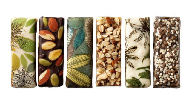 Displaying six distinct flavors of energy bars, featuring a diverse array of ingredients and unique wrapper designs against a transparent background, highlighting healthy snacking options