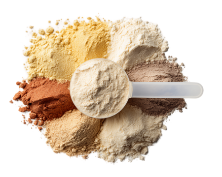 Assortment of Protein Powders with Measuring Scoop, PNG