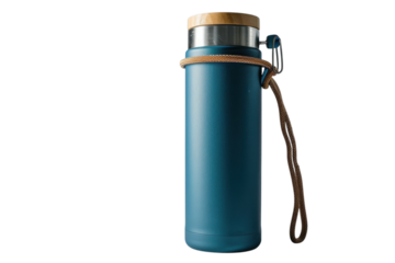 Stylish blue insulated water bottle with wooden lid and carrying strap for outdoor adventures and daily hydration