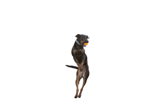 Energetic dog leaps with joy, catching a vibrant ball mid-air against a striking black backdrop, embodying playful pet moments and active canine life