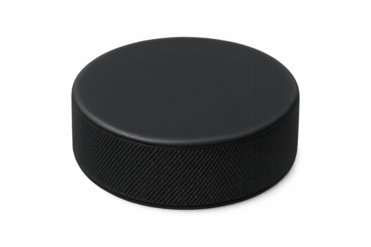 Hockey puck isolating on transparent background, black rubber ice hockey sport equipment for winter game play