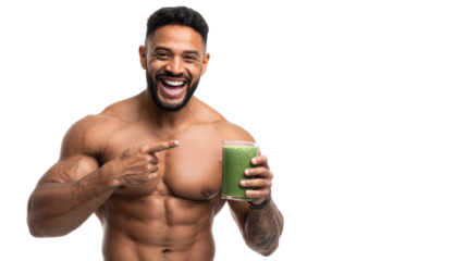 Happy man holding a green smoothie, promoting healthy living and fitness.