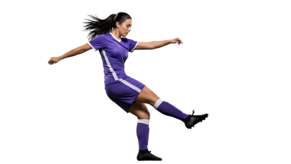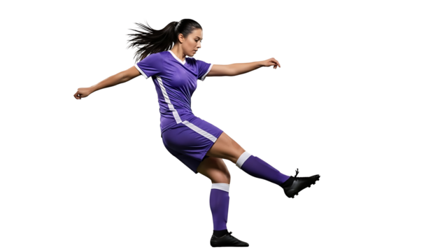 Young male soccer player in white and blue uniform kicking ball isolated on white background