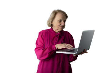Happy senior couple engaging with laptop on transparent background
