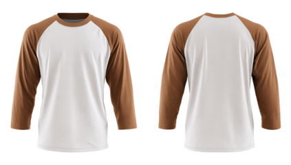 Front and back view of a white t-shirt with rust-colored raglan sleeves