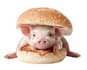 A provocative image of a piglet inside a burger bun, used to highlight anti-meat campaign messaging, blending cuteness with ethical commentary