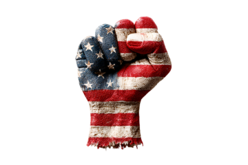 Fist painted with American flag on black background symbolizing patriotism