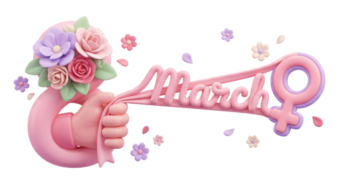 3D illustration of hand holding a flower bouquet and 8 March symbol representing Women's Day for holiday branding