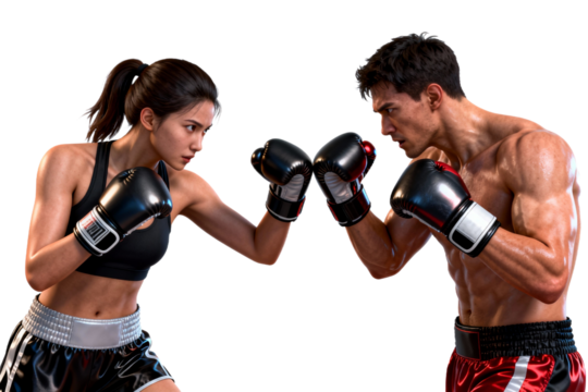 Two muscular boxers in action, exchanging punches during a competitive match isolated on transparent background, showcasing strength, agility, and determination