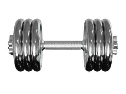 Cast Iron Chrome Adjustable Dumbbell, weightlifting gym equipment, side view. Png clipart isolated on transparent background
