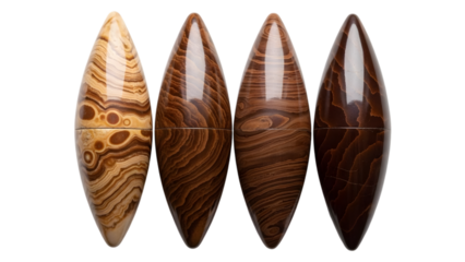 Four polished wooden surfboards isolated on transparent background