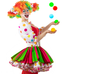 Funny juggler female clown juggling balls in the circus, woman entertainer as Joker in suit and wig, with clown whiteface makeup. Trickster, jester, pantomime, mime, and a professional actor at events