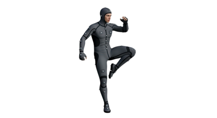 3d model motion capture actor in dynamic pose, hightech suit, ready for action, isolated on transparent background