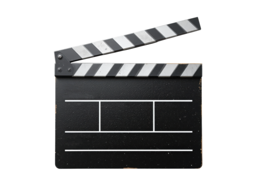 Black clapperboard with white and black stripes on the top slate, isolated on transparent background, film production, cinema, movie.