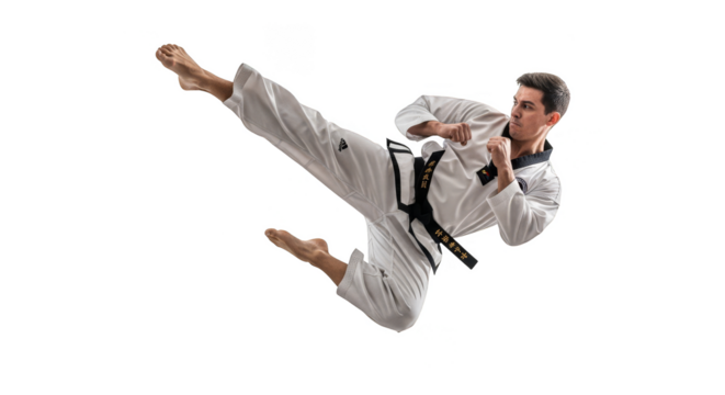 Male martial artist performing a high flying kick in traditional white taekwondo uniform with black belt, isolated on black, perfect for sports and martial arts themes