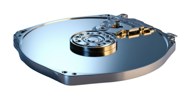 Close-up of a hard disk drive platter, shiny metallic surface