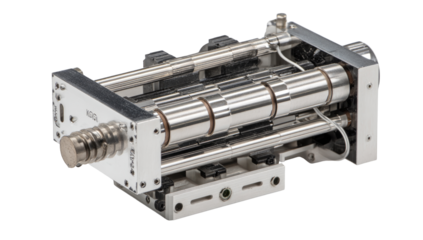 Close-up of a complex, multi-component precision machine assembly