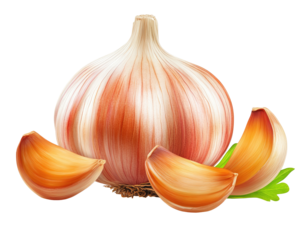 Garlic bulb with two cloves and a leaf, isolated on black background