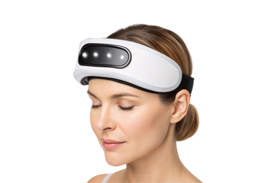 White head massager device with LED lights worn by woman for relaxation therapy, isolated on a transparent background