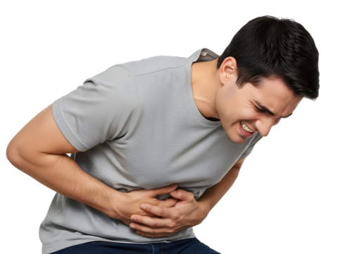 Young man holding his belly suffering from abdominal pain, digestive problem, gastritis, period cramps, appendicitis or food poisoning, isolated on transparent background