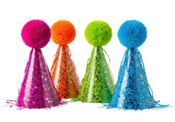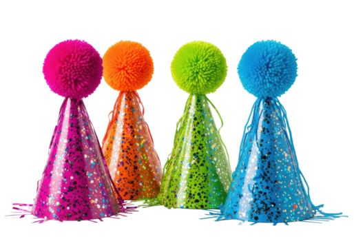 four vivid magenta, orange, green, and blue glossy cone party hats with metallic confetti and fluffy pom-poms, studio shot on a transparent background. Celebration event concept