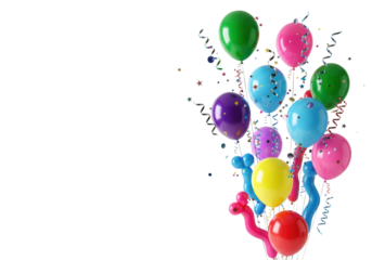 A dynamic burst of glossy latex balloons (green, purple, pink, blue, yellow, red) with metallic confetti and streamers, suspended against a transparent studio background with copy space. Explosive