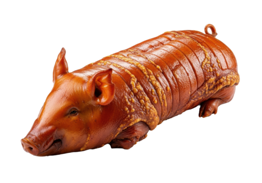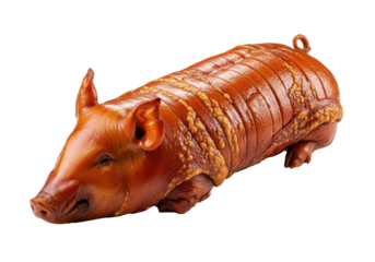 A whole roasted Filipino Lechon with crispy golden-brown skin and a succulent sheen, centrally positioned on a pristine transparent background, Concept for professional food advertising