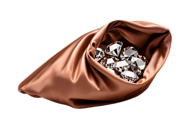 Saco cheio de diamantes. Sacola de pano com vários diamantes dentro.