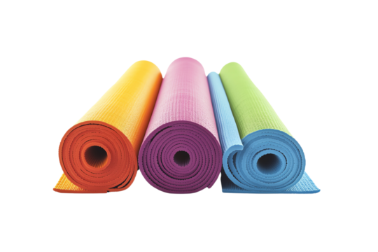 Colorful yoga mats rolled up and ready for practice, perfect for fitness enthusiasts looking to enhance their workout sessions.
