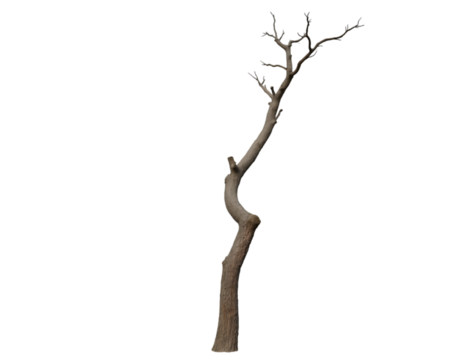 Isolated weathered tree trunk bending to the side evokes resilience and natural beauty, symbolizing nature's strength and adaptability in stark simplicity