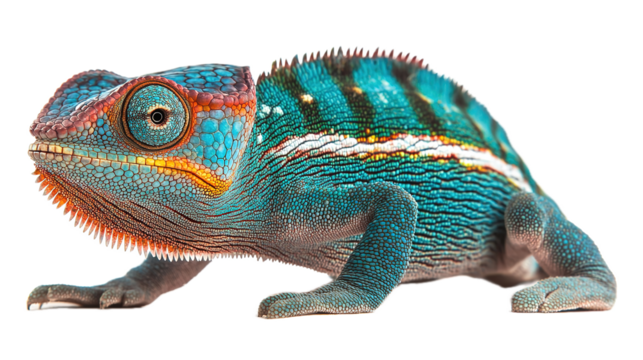 A vibrant green chameleon perched on a branch, showcasing its unique scales and large eye. Its distinctive color and texture highlight its adaptation in nature